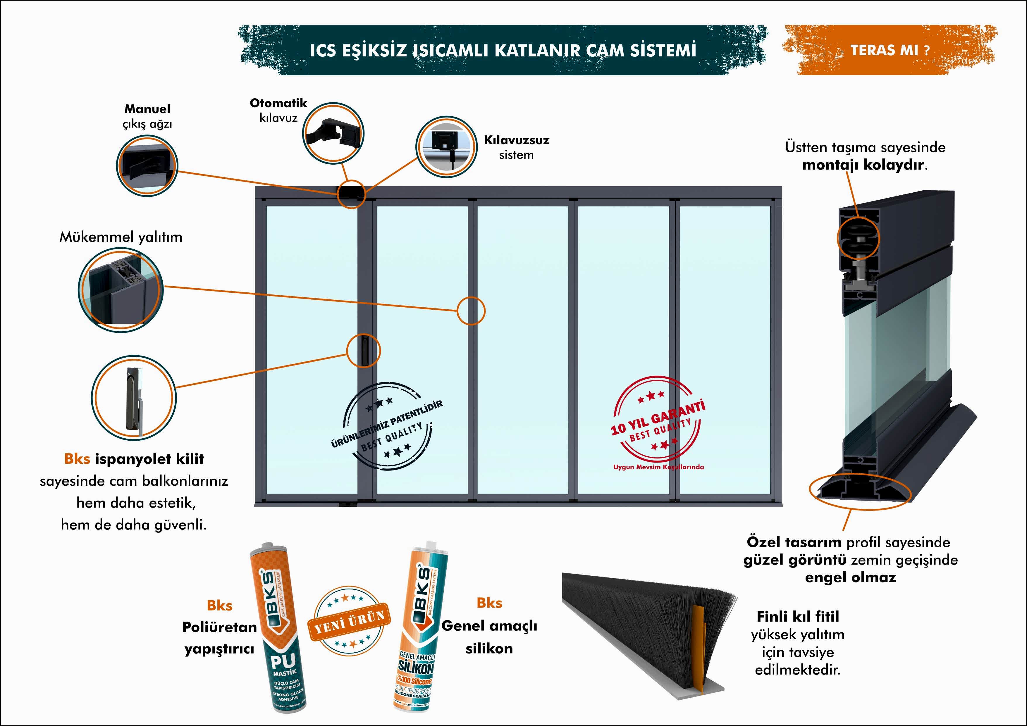 Bu sistem sizlere bir çok imkan sağlamaktadır. Kış aylarında ısı yalıtımlı, yaz aylarında tamamen açıp rahatlıkla kullanabiliyorsunuz. Özel dizayn profil ve fren sistemi sayesinde hiçbir şekilde çıkıntı oluşturmadığından her türlü perde takma imkanı sunmaktadır. Ayrıca sistem açıldığındaki geçiş esnasında zarif dizan edilmiş alt profilleri sayesinde hiç bir engel oluşturmadan kullanabilirsiniz.