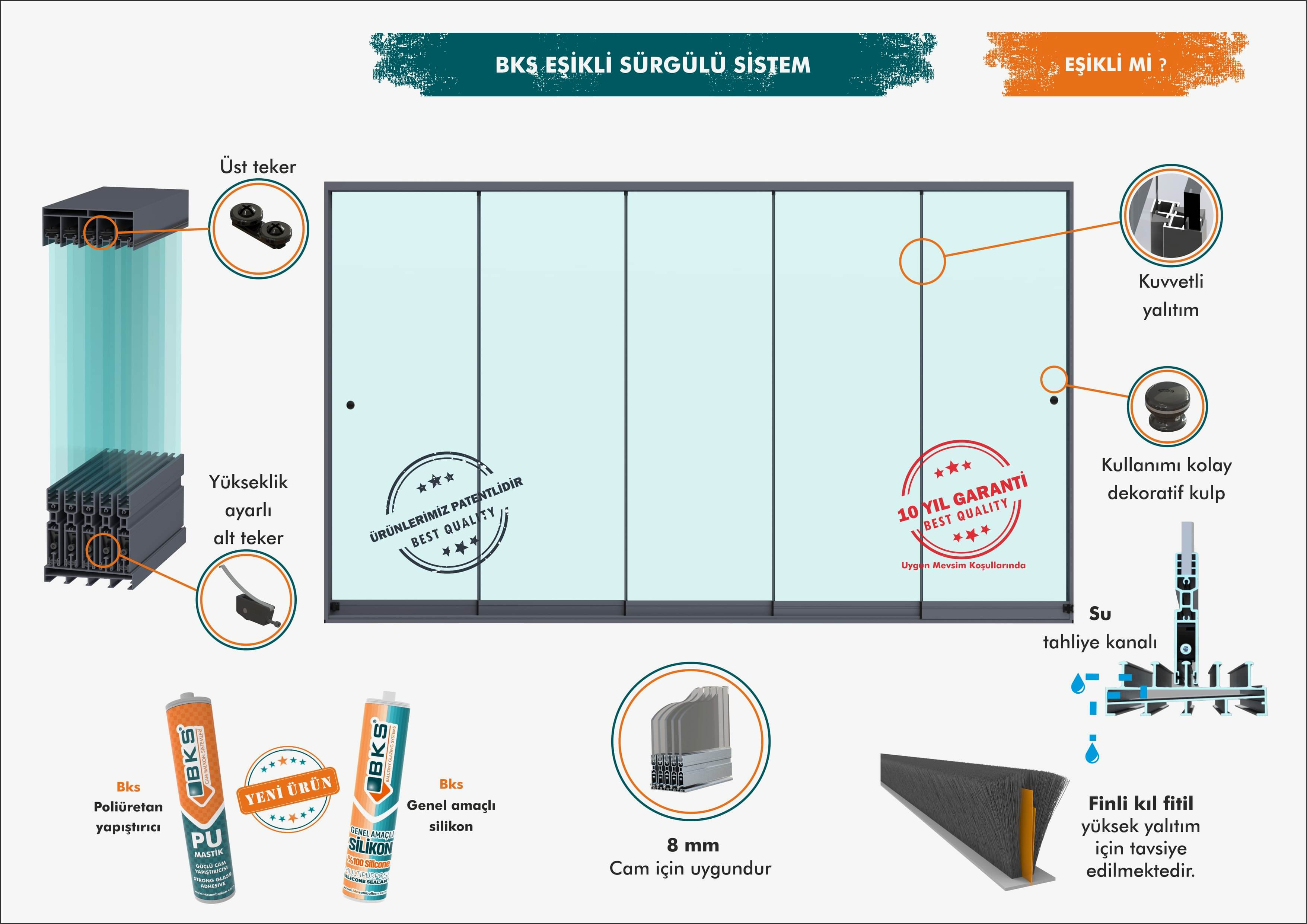 bks eşikli sürgülü sistemlerde 8 mm kalınlığında ve